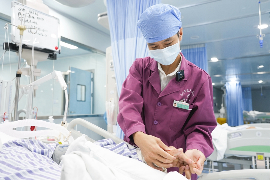 鄒飛為ICU的臥床病人進(jìn)行手部按摩。