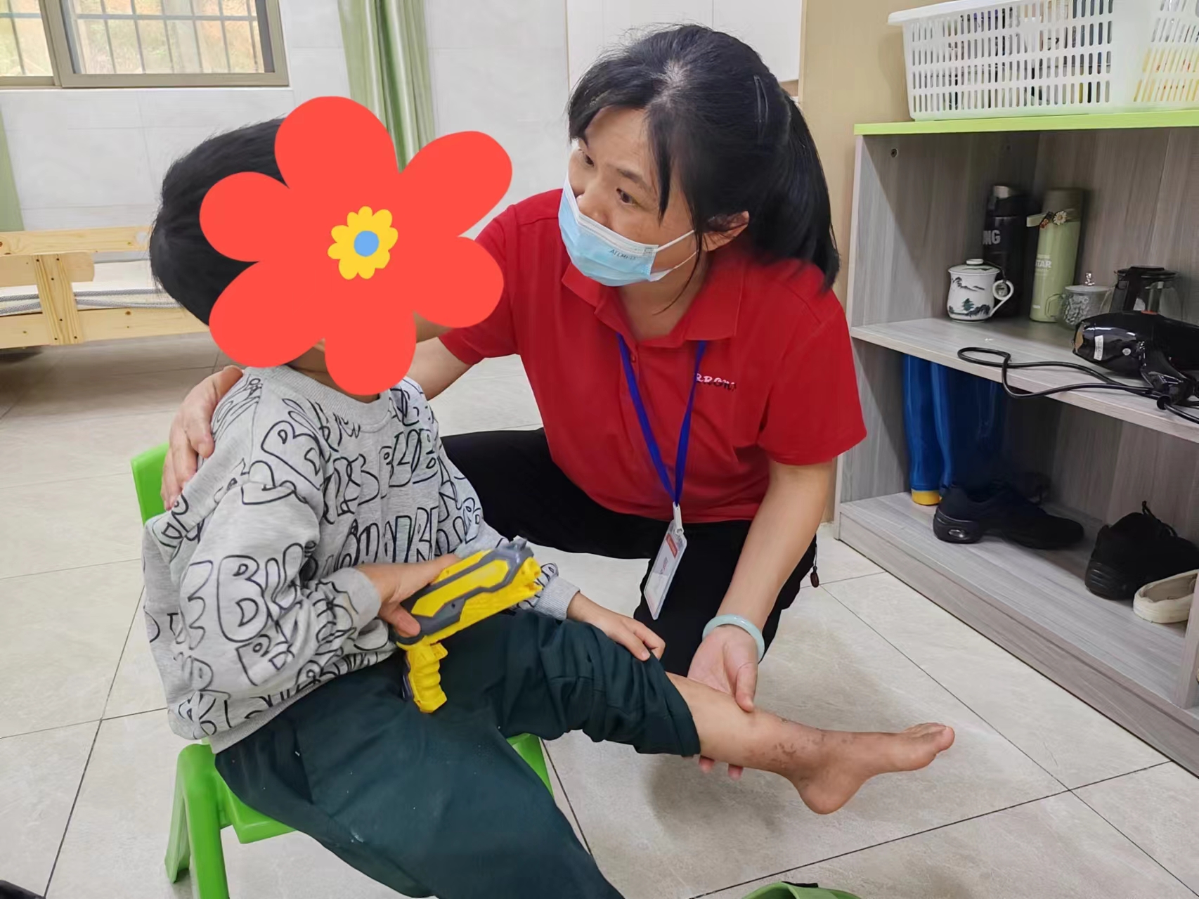 2年前,市兒童福利院接收到一個(gè)唐氏兒小偉(化名)。12歲的小偉跟三四歲的孩子一般高,雙腿變形成羅圈腿,長(zhǎng)期保持著盤腿姿勢(shì),不僅無(wú)法走路,就連睡覺也是坐著的。葉東英在照護(hù)他吃喝拉撒的同時(shí),和同事輪流對(duì)他進(jìn)行腳部康復(fù)按摩。