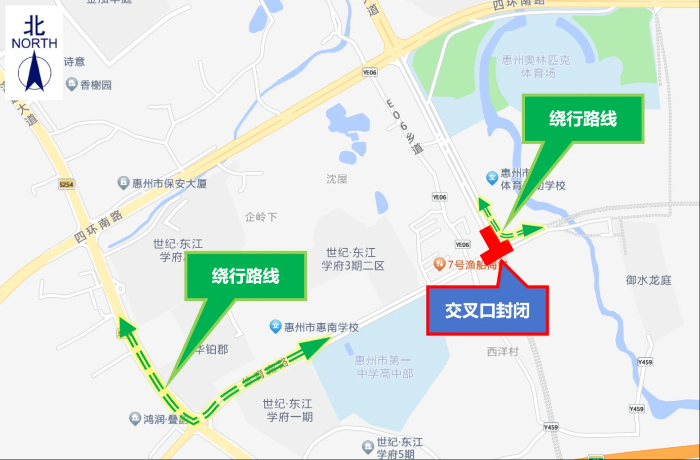 交通管制期間,往返惠州市第一中學(xué)(高中部)、世紀(jì)東江學(xué)府等學(xué)校或小區(qū)的行人和車輛,請通過演達(dá)大道繞行;往返惠州市體育運(yùn)動(dòng)學(xué)校、御水龍庭等學(xué);蛐^(qū)的行人和車輛,可通過惠州市體育運(yùn)動(dòng)學(xué)校西南側(cè)輔道繞行。