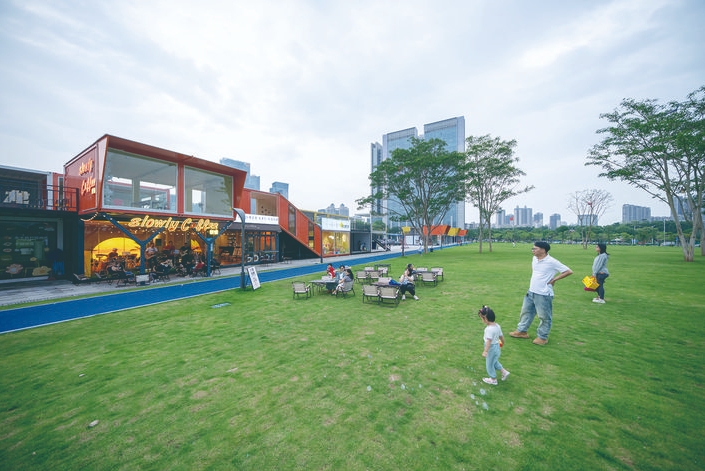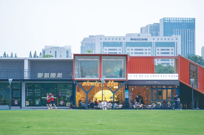 在靠近博物館的一側(cè),有一排五顏六色的集裝箱潮流商鋪,涵蓋親子樂園、音樂餐吧、茶飲店、文創(chuàng)作坊等類型,駐場(chǎng)歌手的歌聲不時(shí)讓散步市民側(cè)目。據(jù)悉,市民樂園二期項(xiàng)目在不斷完善建設(shè)的同時(shí),尤其注重場(chǎng)景營造和業(yè)態(tài)融合,引入豐富多樣的零售商業(yè)業(yè)態(tài),為江北CBD區(qū)域增添人文煙火氣。