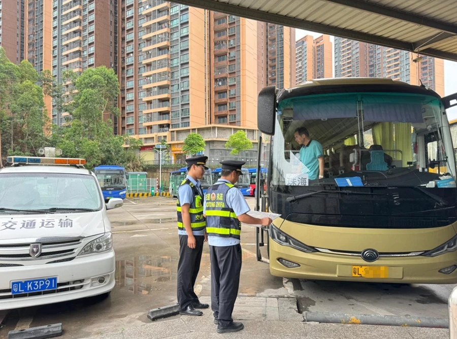 交通執(zhí)法人員檢查客運車輛。