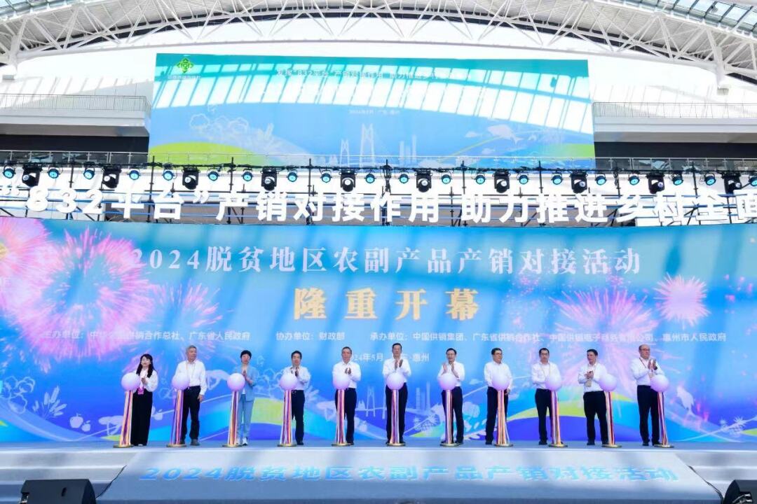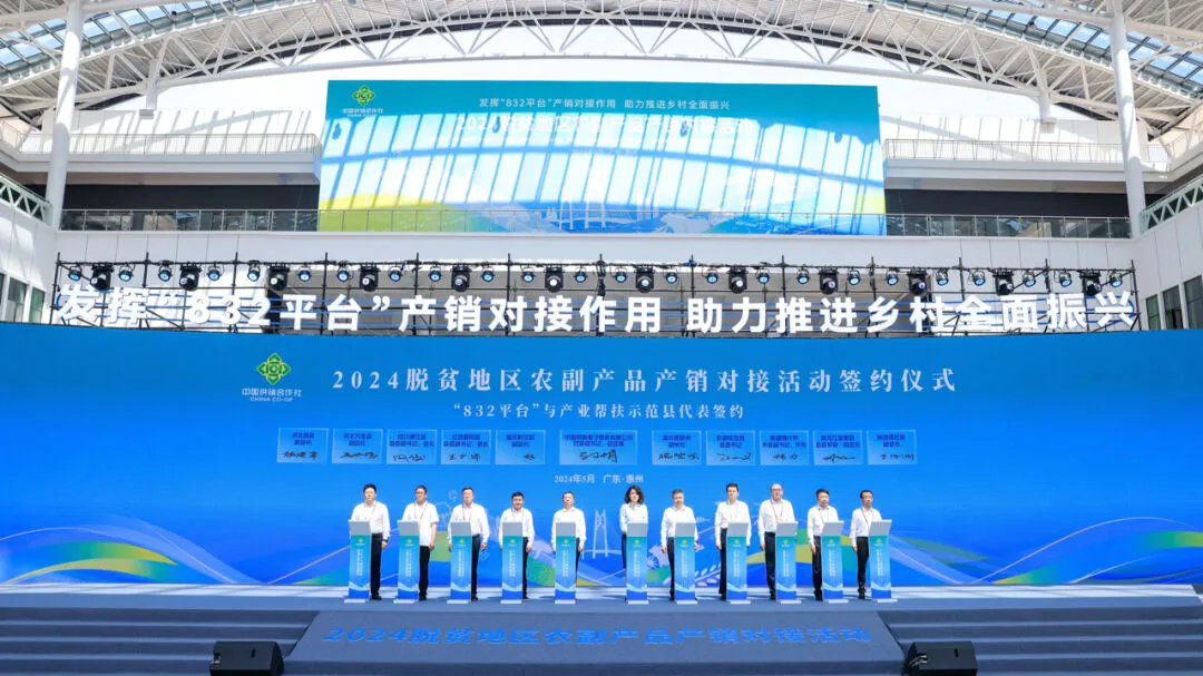 2024年5月15日,2024脫貧地區(qū)農(nóng)副產(chǎn)品產(chǎn)銷對(duì)接活動(dòng)在廣東省惠州市粵港澳大灣區(qū)綠色農(nóng)產(chǎn)品生產(chǎn)供應(yīng)基地勝利開(kāi)幕,“832平臺(tái)產(chǎn)業(yè)幫扶示范縣”項(xiàng)目集體亮相。在產(chǎn)銷對(duì)接活動(dòng)開(kāi)幕式上,產(chǎn)業(yè)幫扶示范縣政府代表新疆喀什市市委副書(shū)記、市長(zhǎng)偉力·阿西木作為脫貧地區(qū)地方政府代表發(fā)言、“黔江羊肚菌”推介官作為優(yōu)質(zhì)農(nóng)產(chǎn)品推介代表上臺(tái)“帶貨”,第二批10家“832平臺(tái)產(chǎn)業(yè)幫扶示范縣”集體簽約并授牌。在“832平臺(tái)成就展”特設(shè)“產(chǎn)業(yè)幫扶示范縣”展區(qū),集中展示恩施硒茶、臨泉豬肉、一盒子喀什、金寨山茶油等脫貧地區(qū)“土特產(chǎn)”打造成果。