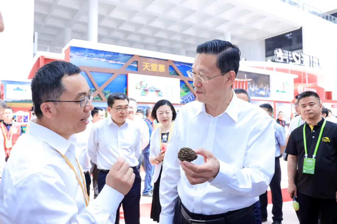 重慶黔江區(qū)副區(qū)長(zhǎng)毛立新向中華全國(guó)供銷合作總社黨組書(shū)記、理事會(huì)副主任韓立平介紹“黔江羊肚菌”