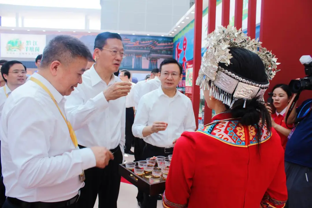 湖北恩施州副州長(zhǎng)楊盛僚向中華全國(guó)供銷合作總社黨組書(shū)記、理事會(huì)副主任韓立平介紹“恩施硒茶”
