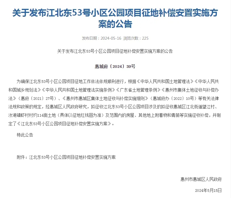 根據(jù)《方案》,此次擬征地范圍為惠城區(qū)江北街道望江村、汝湖鎮(zhèn)蝦村村約114畝(約7.6萬平方米),用于江北東53號小區(qū)公園項目建設(shè)。