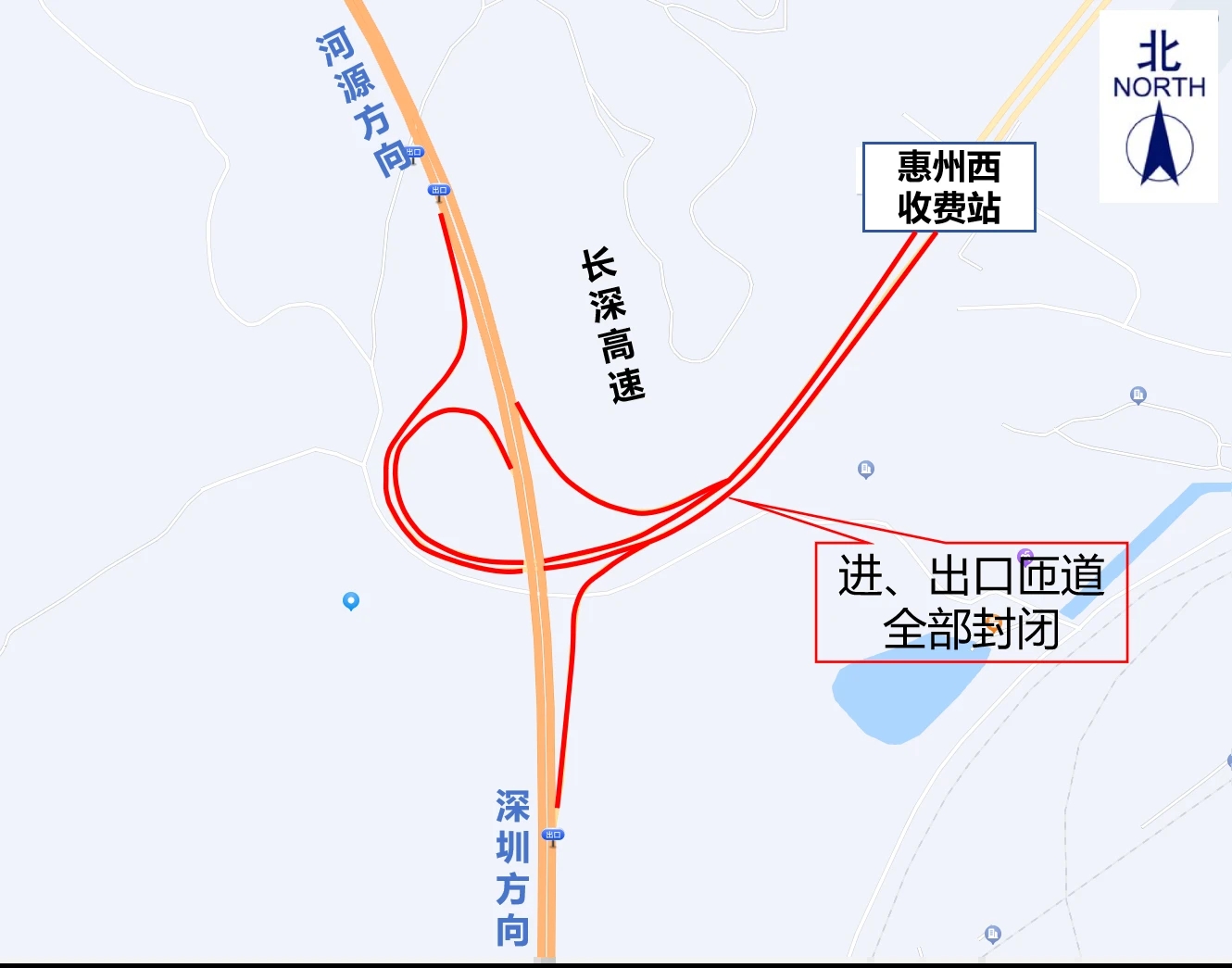 其中,6月13日12:00至7月30日12:00,長深高速惠州段(惠河高速公路)惠州西收費(fèi)站進(jìn)、出口匝道全部封閉,禁止車輛通行;