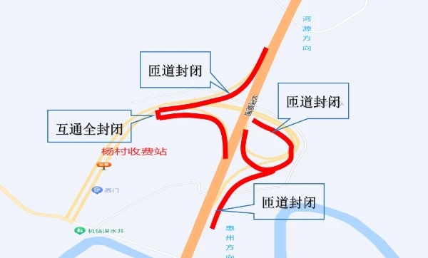 5月30日12:00至7月30日12:00,長深高速惠州段(惠河高速公路)楊村收費(fèi)站進(jìn)、出口匝道全部封閉,禁止車輛通行;