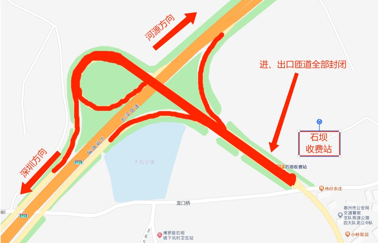 6月1日12:00至12月31日12:00,長深高速惠州段(惠河高速公路)石壩收費(fèi)站進(jìn)、出口匝道全部封閉,禁止車輛通行。