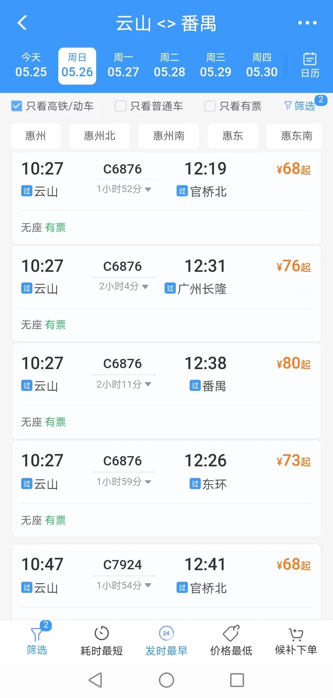 惠州西湖東站到廣州長隆站用時最快1小時15分