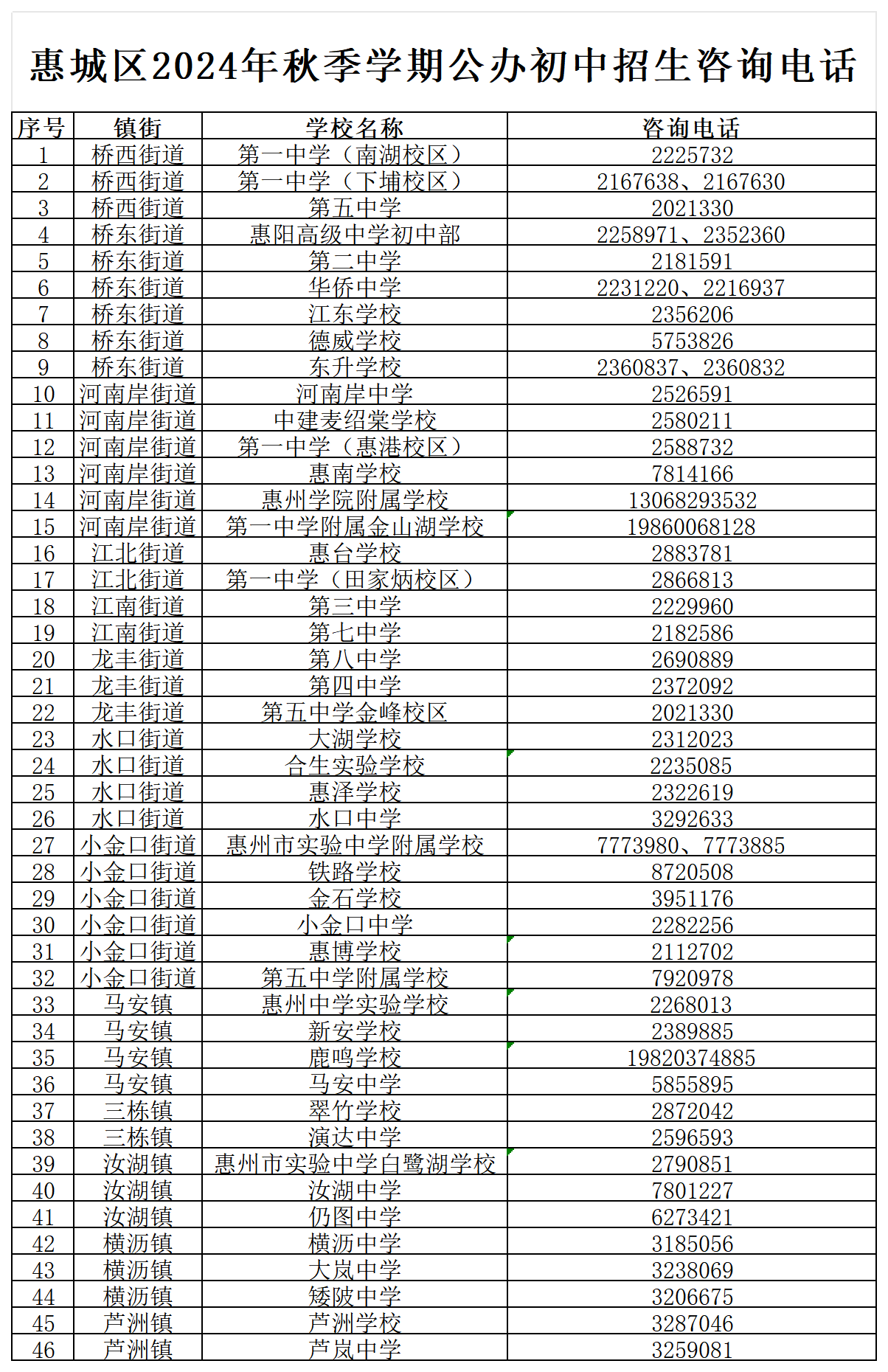1.惠城區(qū)2024年秋季學(xué)期公辦初中招生咨詢電話