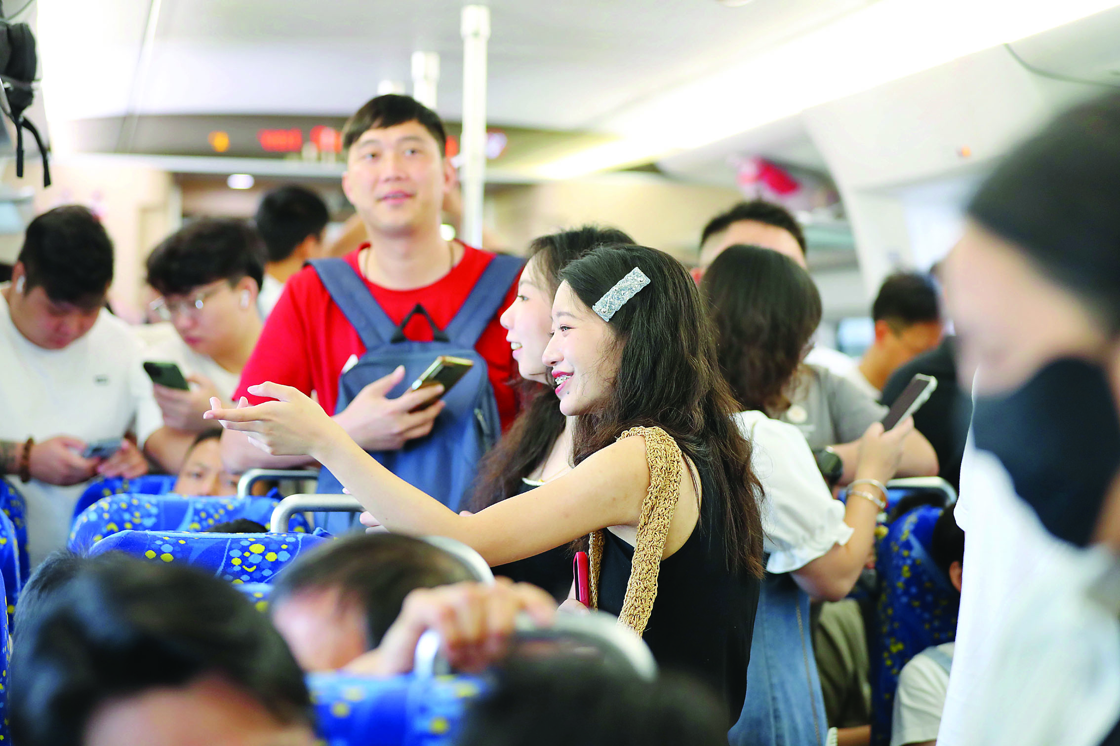 東莞至番禺段客流增加,旅客在車(chē)廂交流乘車(chē)感受。