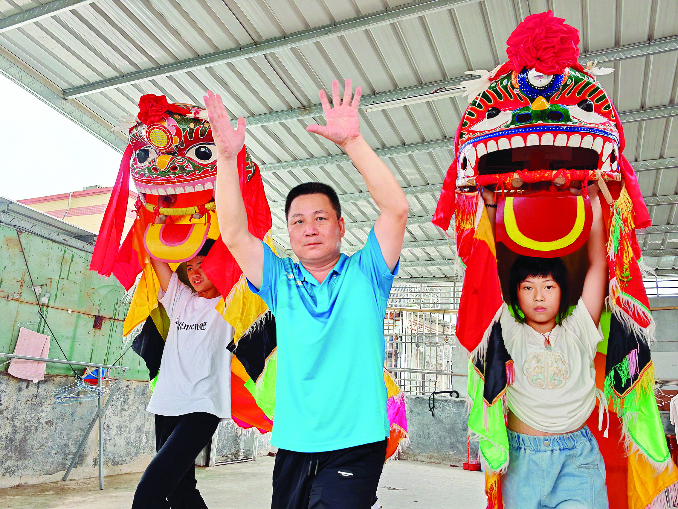 魏婕宜(右一)跟著外公練習(xí)麒麟舞。