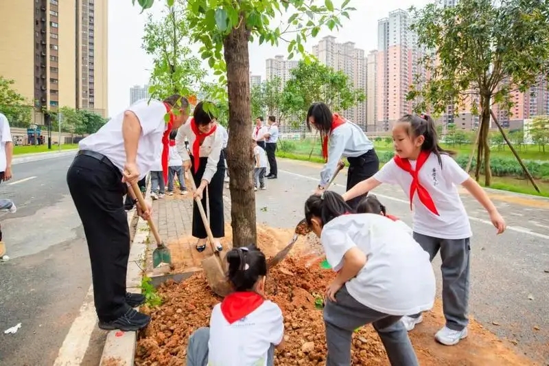 莊嚴(yán)的入隊(duì)儀式結(jié)束后,隊(duì)員們開(kāi)展“入隊(duì)種棵樹(shù)”活動(dòng)。在輔導(dǎo)員的帶領(lǐng)下,他們拿起鏟子、水桶,揮鍬填土、踩實(shí)松土、提桶澆水,相互合作,干得熱火朝天。一株新苗,一鍬厚土,一瓢清水,樹(shù)木植于土,把保護(hù)環(huán)境、熱愛(ài)自然的種子播撒到少先隊(duì)員心中。一(1)中隊(duì)的少先隊(duì)員彭紫嫣說(shuō):“今天,我和同學(xué)們一起入隊(duì)了,并且種下一棵小樹(shù),就像老師和爸爸媽媽們呵護(hù)我們成長(zhǎng)一樣,我小心翼翼為小樹(shù)澆水、填土。希望我能和這棵小樹(shù)一樣茁壯成長(zhǎng),成為優(yōu)秀的少先隊(duì)員,為其他同學(xué)樹(shù)立一個(gè)好的榜樣!”