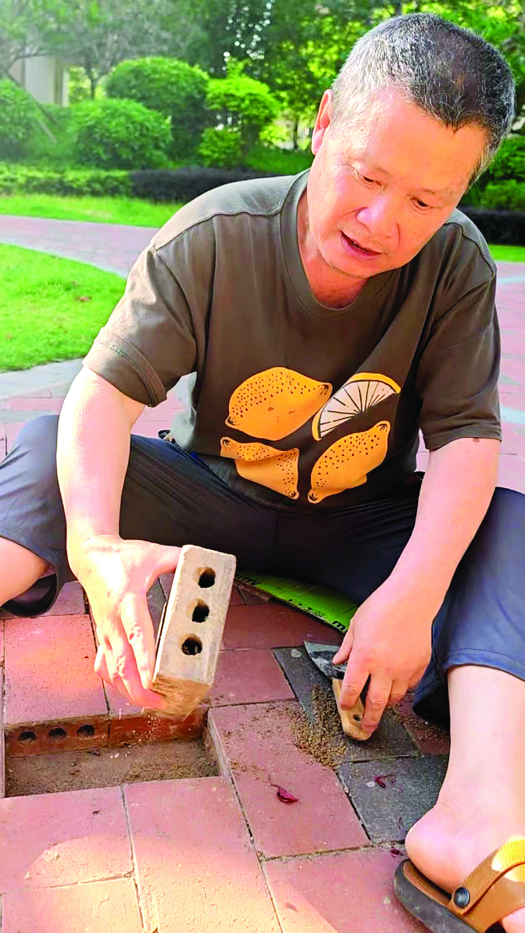 記者了解到,劉叔是居住在該小區(qū)里的居民。此前他聽到鄰居議論,小區(qū)磚塊松動有時會絆倒小孩,雨天時鄰居踩在松動磚塊上還時不時被底下藏著的泥水濺一身,劉叔聽了心里不是滋味。松動磚塊的量不是特別多且范圍不集中,這種“小工程”小區(qū)物業(yè)就算找修理工人也不一定愿意來。劉叔當(dāng)即決定自己動手修理松動磚塊。他跟小區(qū)附近的裝修公司“討來”一些水泥,自己調(diào)和成半干濕的水泥漿,把松動磚塊小心翼翼撬開,把多余的沙子清理后,再把磚塊壓緊,然后用半干濕水泥填好縫固定。等水泥全干后,磚塊就變牢固了。
