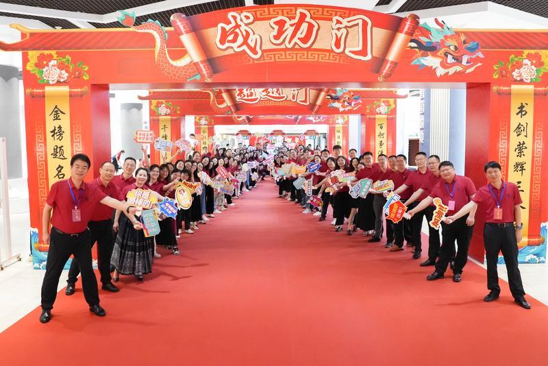 在惠州中學(xué),校領(lǐng)導(dǎo)帶領(lǐng)高三年級(jí)全體教師站在紅毯兩旁為2024屆考生送上祝福。身穿紅色上衣的老師們,和考生一一擊掌,目送他們走向“成功門(mén)”。