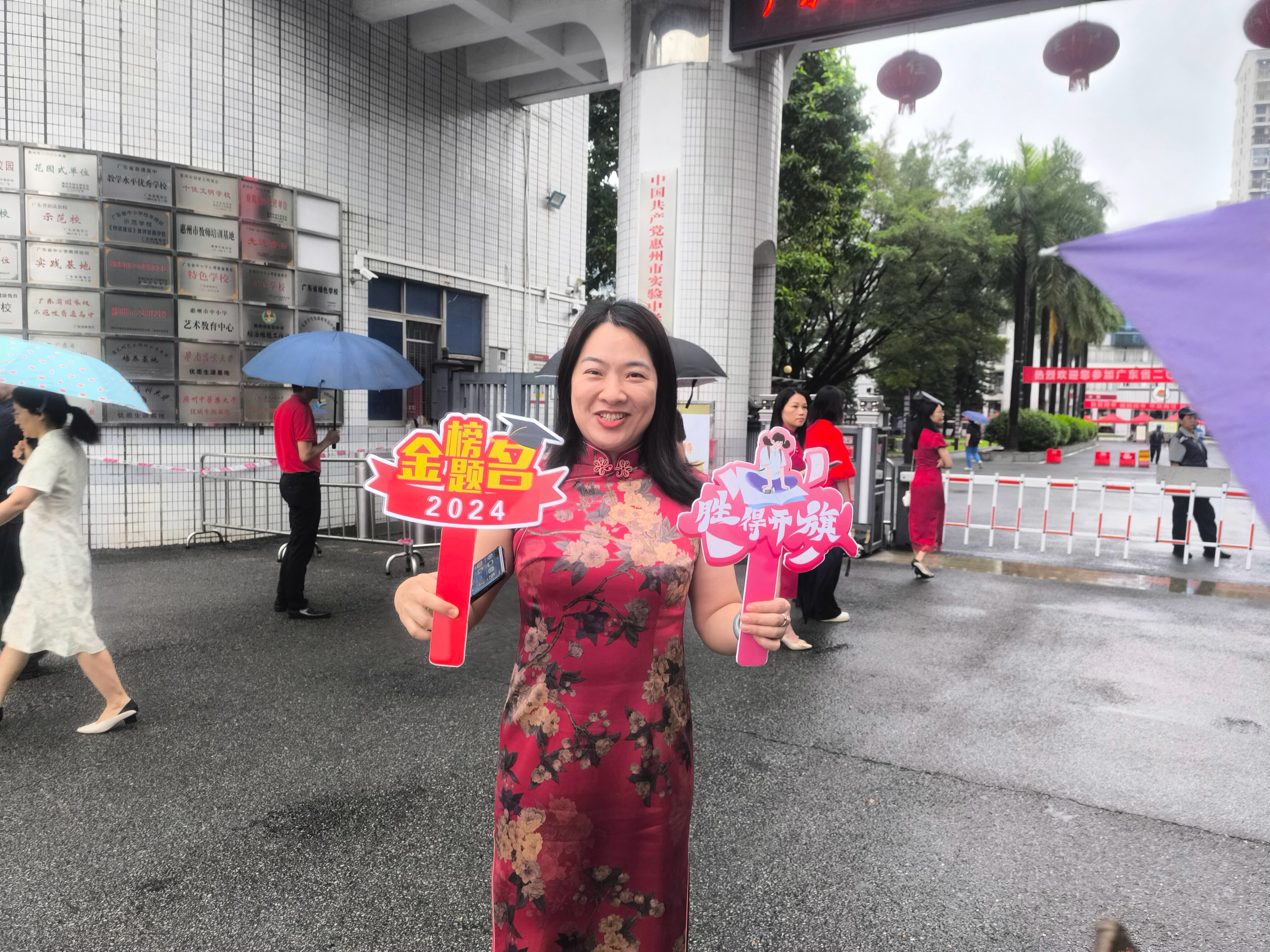 家長(zhǎng)穿旗袍送考,寓意“旗開(kāi)得勝”。 惠州日?qǐng)?bào)記者記者范文燕 賴華海 攝