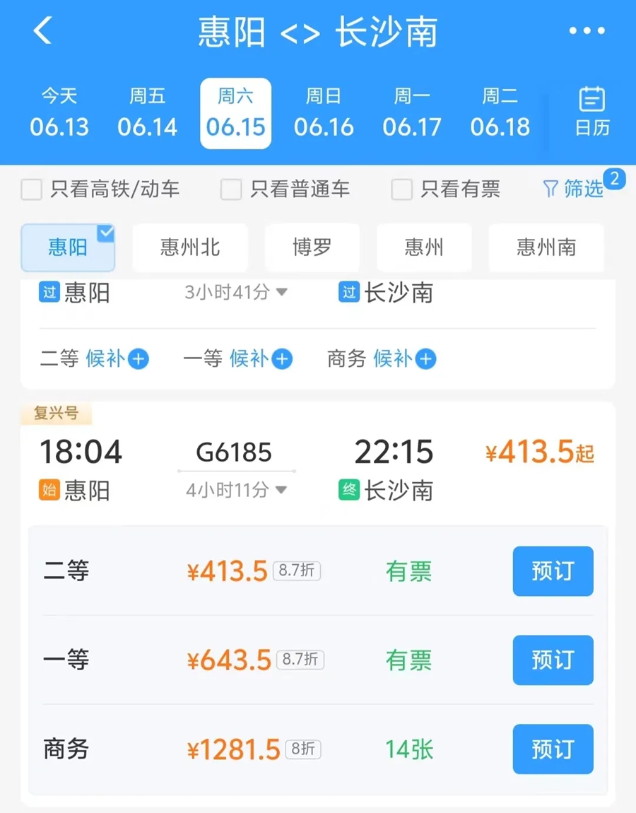 據(jù)介紹,此次調圖,惠陽站首次開行往長沙南方向始發(fā)列車,車次為G6185/4 次,該次列車于18:04從惠陽站始發(fā),途中先后在深圳坪山、深圳北、虎門、廣州南、韶關、樂昌東、郴州西等7個站點?浚22:15抵達終點站長沙南。據(jù)12306APP顯示,始發(fā)惠陽站、終點長沙南站車次的二等票價為413.5元。