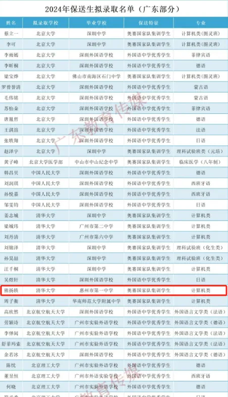 名單顯示,2024年,惠州市第一中學學生熊揚軼作為奧賽國家隊集訓學生,被保送至清華大學計算機類專業(yè)。
