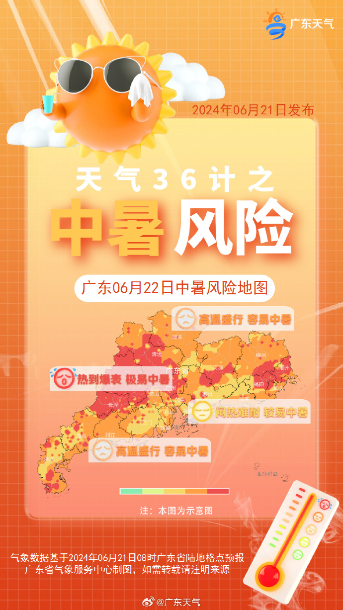 22日,副高控制下,廣東陸地天氣高溫炎熱,局地有分散陣雨或雷雨;