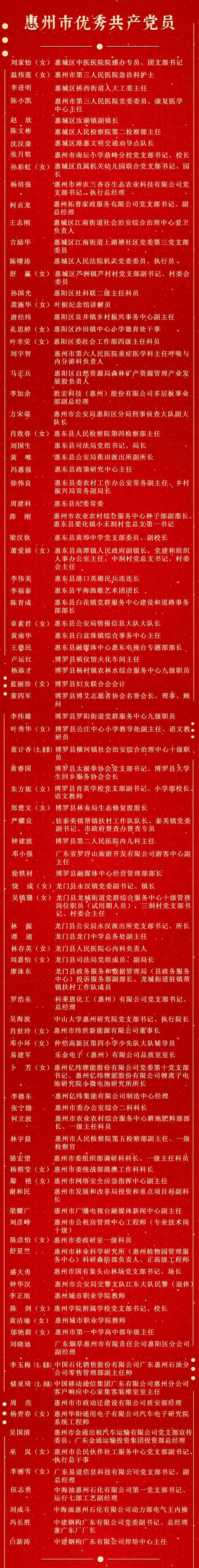 為表彰先進(jìn)、弘揚(yáng)正氣,激勵(lì)全市各級黨組織和廣大黨員再接再厲、擔(dān)當(dāng)作為,加快打造廣東高質(zhì)量發(fā)展新增長極,市委決定,授予劉家怡等96名同志“惠州市優(yōu)秀共產(chǎn)黨員”稱號,授予謝榮榮等91名同志“惠州市優(yōu)秀黨務(wù)工作者”稱號,授予惠城區(qū)龍豐街道新聯(lián)社區(qū)黨委等122個(gè)黨組織“惠州市先進(jìn)基層黨組織”稱號。