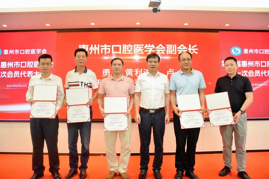唐尤超(右三)為新一屆惠州市口腔醫(yī)學會副會長頒發(fā)聘書。