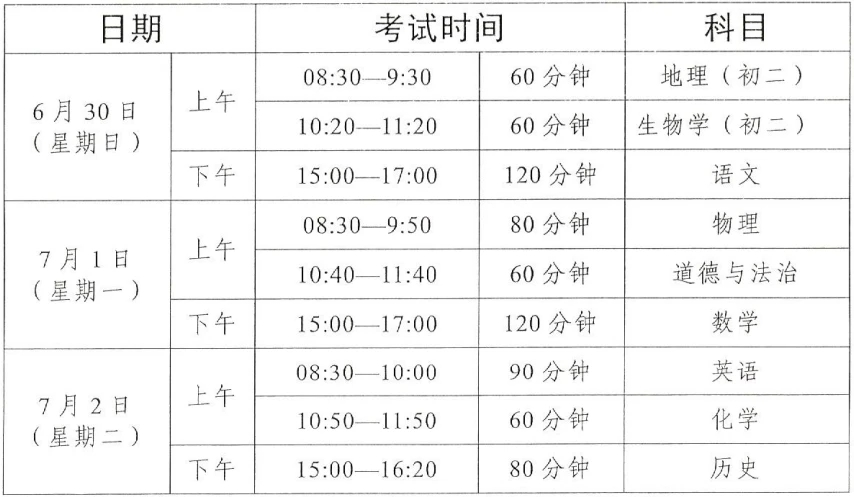 需要注意的是,7月2日上午英語考試將在開考前15分鐘禁止進入考場,考生須在8:15前進入考場。其他科目在開考15分鐘后禁止進入考場。每科考試結(jié)束前15分鐘起方可交卷出場?紙銮胺教峁⿸扃,時間僅供參考,考試時間一律以考點統(tǒng)一發(fā)出的信號為準。