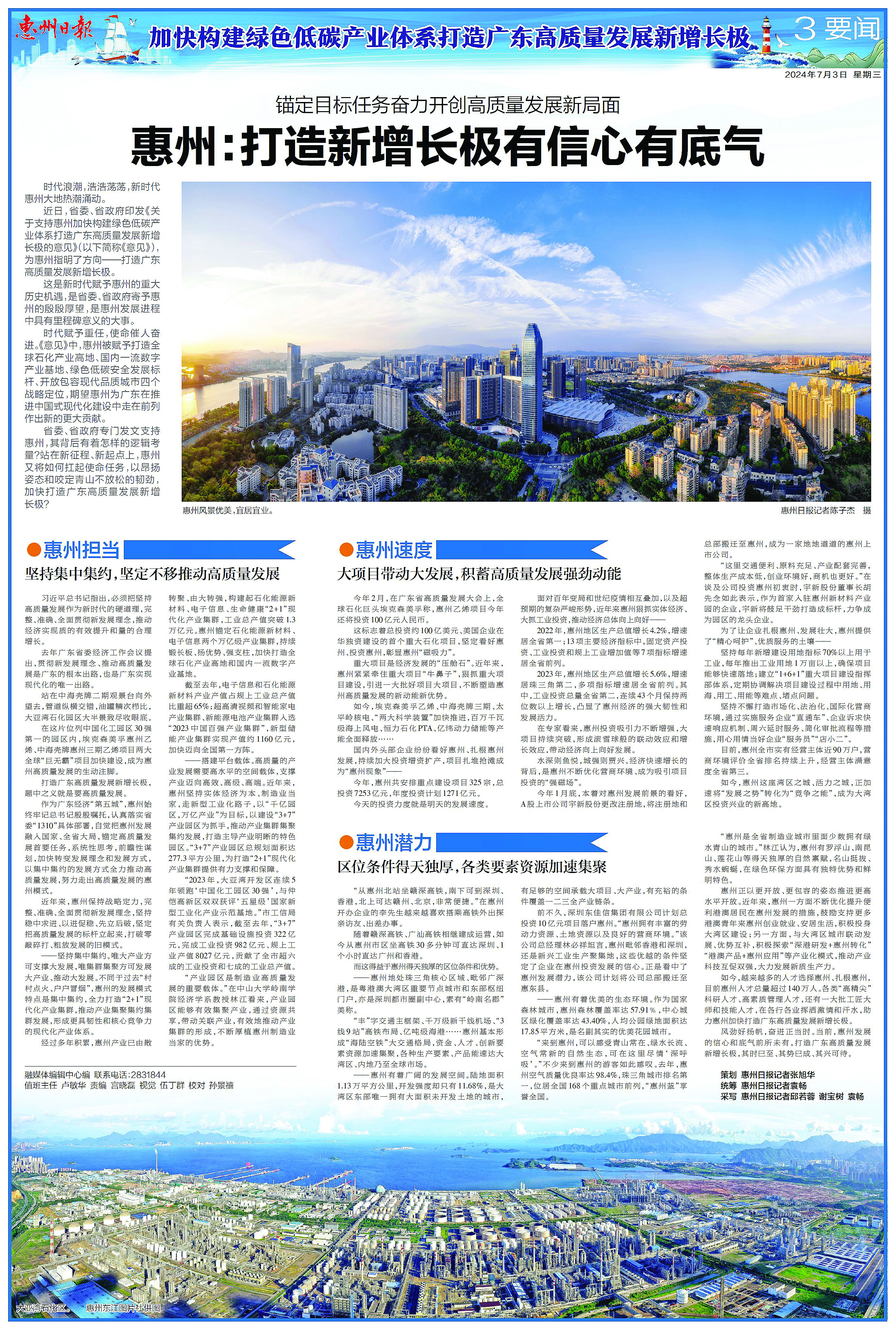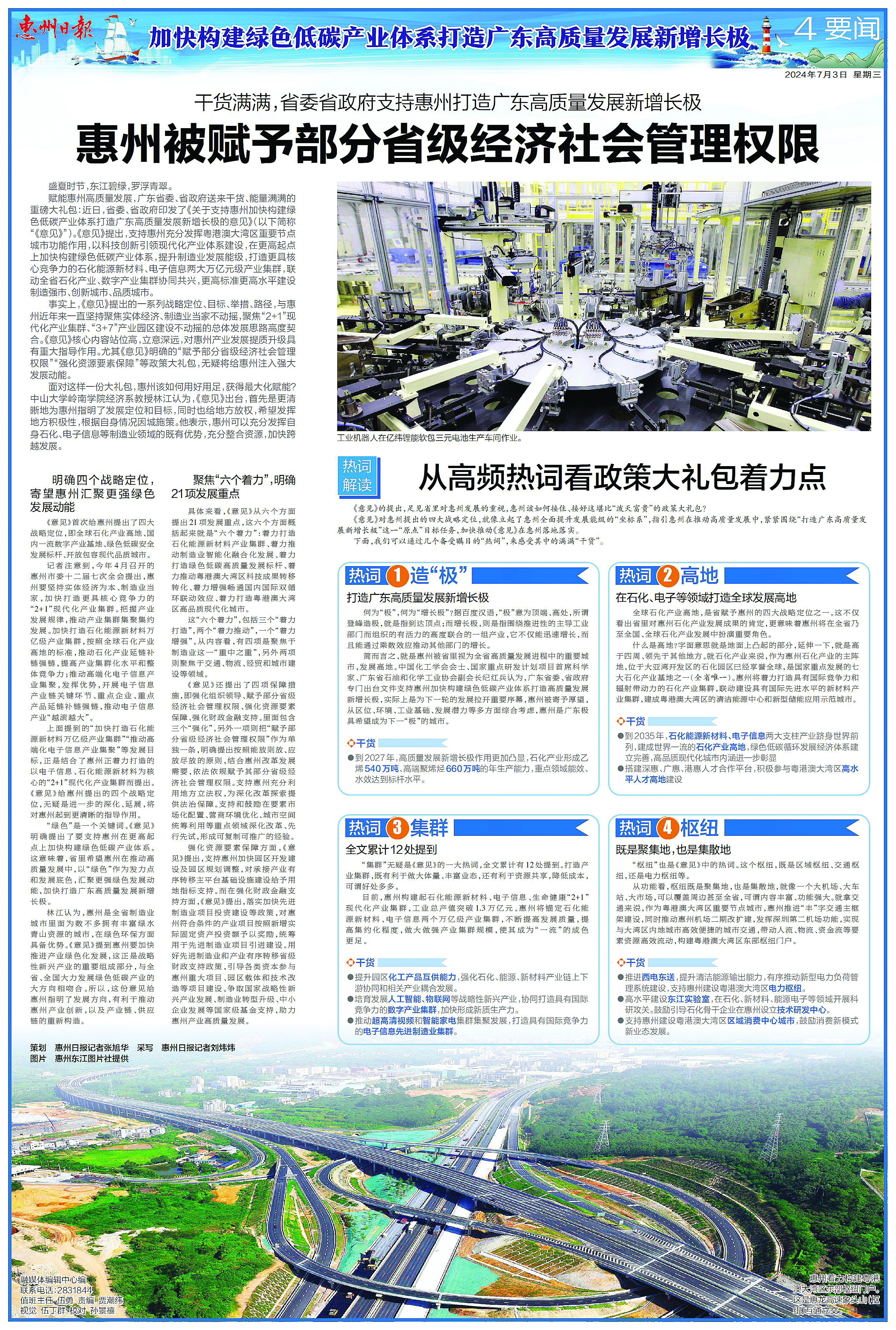 惠州日?qǐng)?bào)訊 (記者邱若蓉 通訊員慶偉)近日,省委、省政府印發(fā)了《關(guān)于支持惠州加快構(gòu)建綠色低碳產(chǎn)業(yè)體系打造廣東高質(zhì)量發(fā)展新增長(zhǎng)極的意見(jiàn)》(以下簡(jiǎn)稱《意見(jiàn)》),賦予惠州全球石化產(chǎn)業(yè)高地、國(guó)內(nèi)一流數(shù)字產(chǎn)業(yè)基地、綠色低碳安全發(fā)展標(biāo)桿、開(kāi)放包容現(xiàn)代品質(zhì)城市四大戰(zhàn)略定位,推動(dòng)惠州全面提升發(fā)展能級(jí),順應(yīng)新時(shí)代要求加快高質(zhì)量發(fā)展,著力打造廣東高質(zhì)量發(fā)展新增長(zhǎng)極。