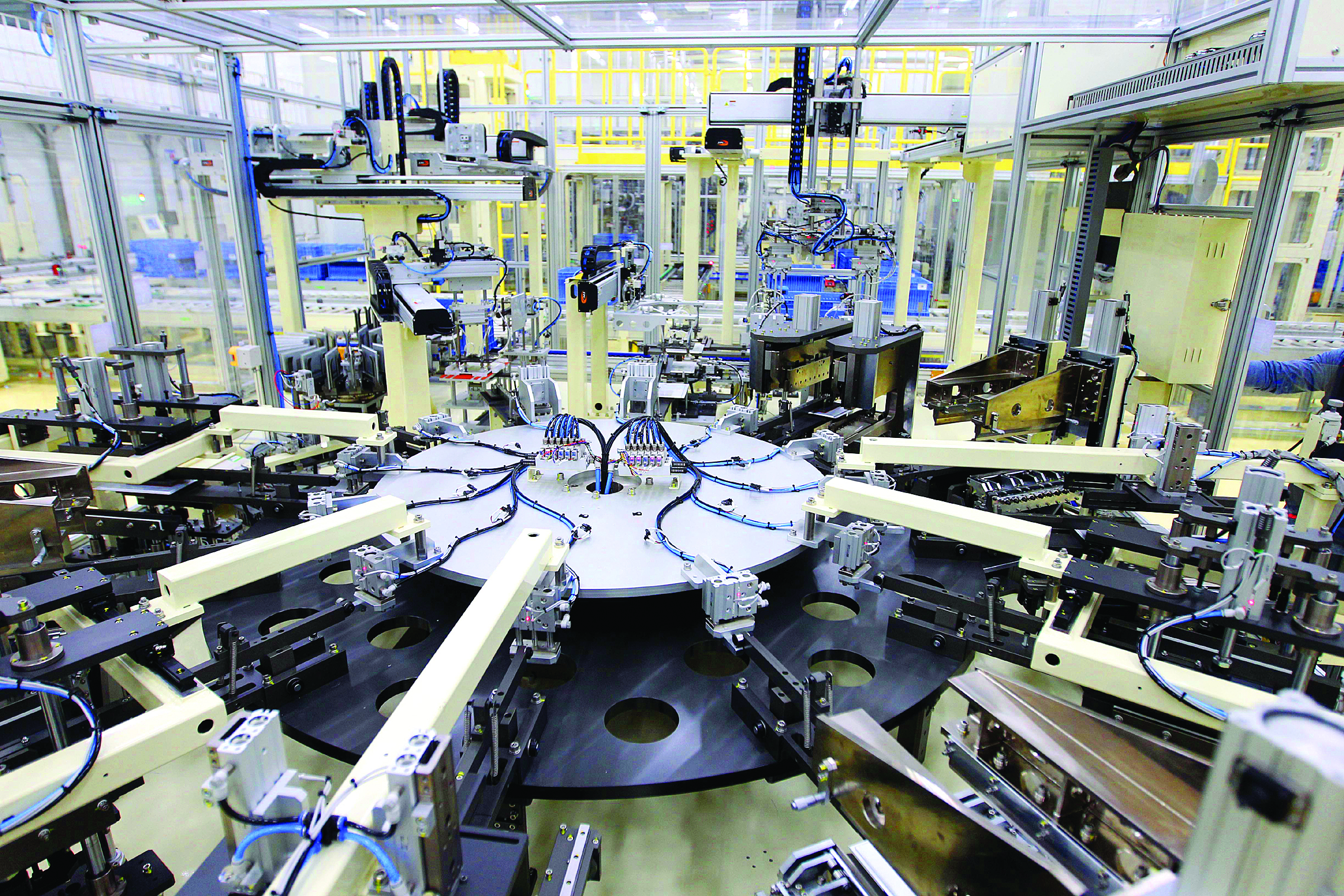 工業(yè)機(jī)器人在億緯鋰能軟包三元電池生產(chǎn)車間作業(yè)。