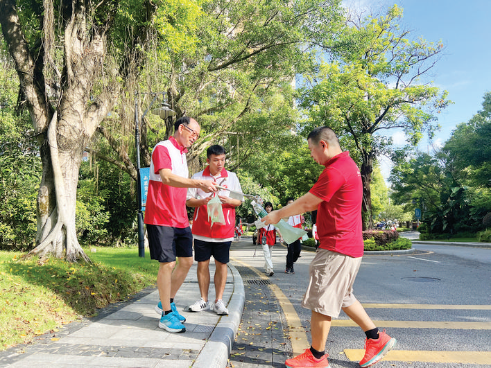啟動儀式后,志愿者們身穿紅馬甲,手持垃圾袋、垃圾鉗等工具,沿著設(shè)定路線邊慢跑邊撿起沿途的垃圾。