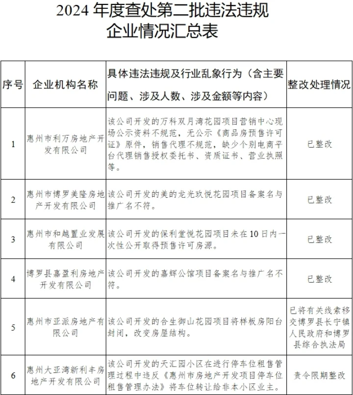 7月8日,惠州市房地產(chǎn)市場(chǎng)監(jiān)督管理工作領(lǐng)導(dǎo)小組辦公室發(fā)布《關(guān)于2024年度查處第二批違法違規(guī)房地產(chǎn)開(kāi)發(fā)企業(yè)、中介機(jī)構(gòu)和物業(yè)服務(wù)企業(yè)名單的公告》,18家房地產(chǎn)開(kāi)發(fā)企業(yè)、中介機(jī)構(gòu)和物業(yè)服務(wù)企業(yè)涉嫌違規(guī)而被查處。目前,部分違規(guī)情況已經(jīng)整改。
