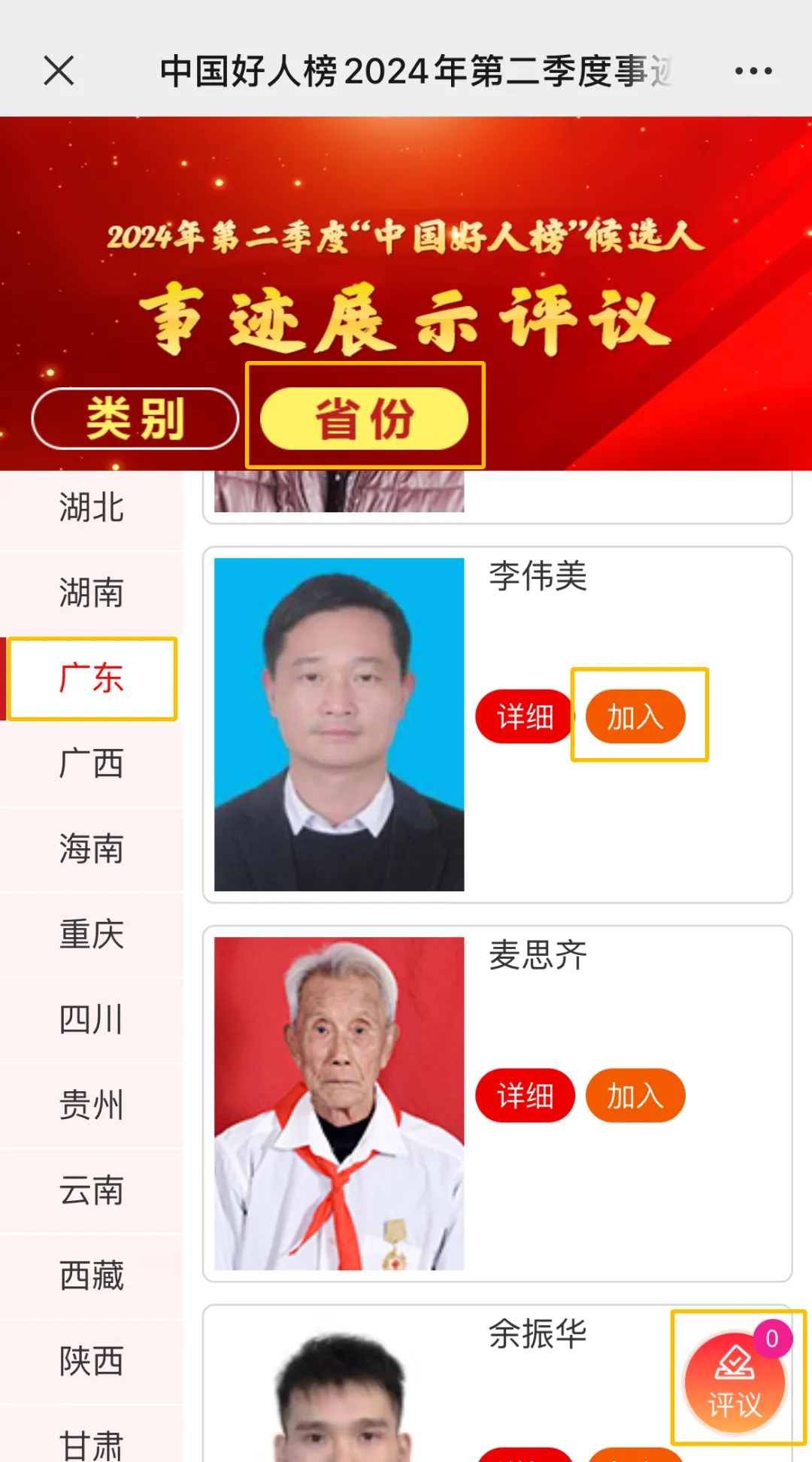 1.在頁(yè)面點(diǎn)擊“省份-廣東”,將候選人“加入”列表,點(diǎn)擊右下角“評(píng)議”。