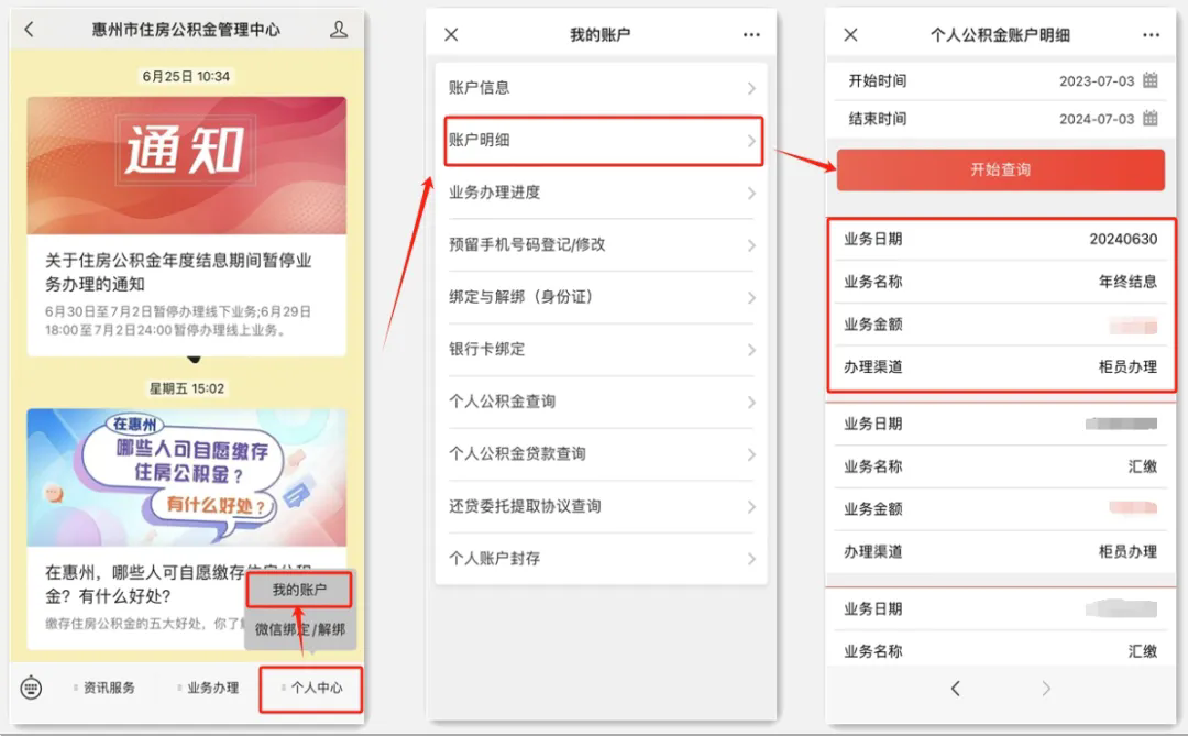 在惠州市住房公積金管理中心公眾號(hào)首頁(yè),依次點(diǎn)擊【個(gè)人中心】-【我的賬戶】-【賬戶明細(xì)】,點(diǎn)擊“開(kāi)始查詢”即可查看結(jié)息金額。
