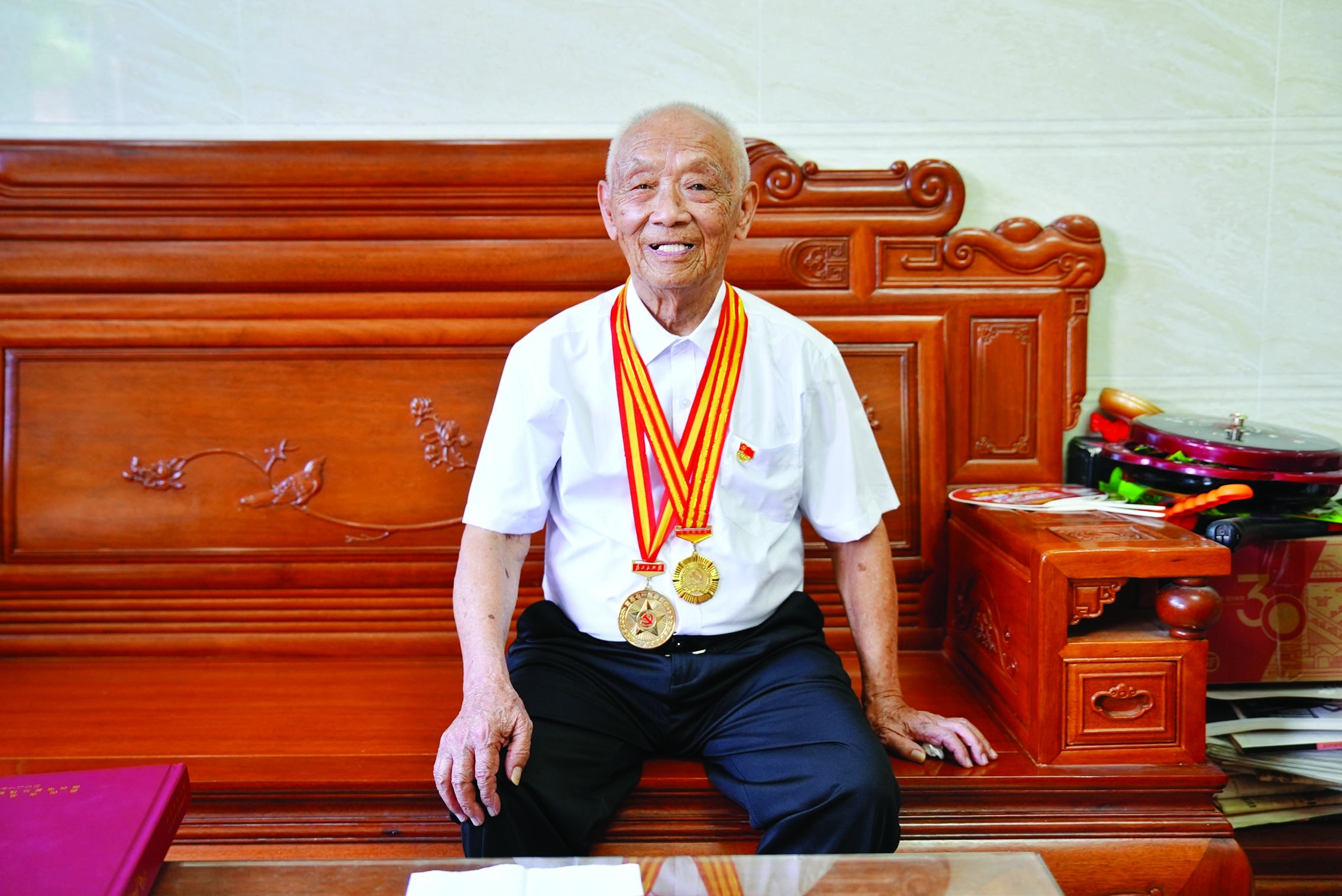 得知記者要來(lái)家里采訪,朱厚早早換上了新的白襯衫,戴好黨員徽章,老照片、獎(jiǎng)?wù)潞妥C書等整齊地?cái)[放在茶幾上。7月初,這位102歲的老黨員,來(lái)到惠州市“兩優(yōu)一先”表彰大會(huì)暨“三個(gè)第一”發(fā)布儀式現(xiàn)場(chǎng),獲頒“三個(gè)第一”紀(jì)念證書。