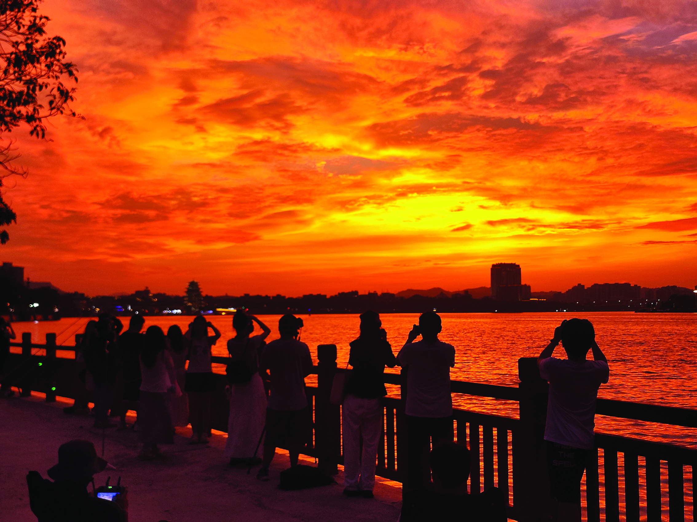7月24日傍晚,太陽落山后,惠州天空出現(xiàn)火燒云,晚霞如烈火燃燒,染紅了整個天際,熱烈而浪漫,吸引不少市民駐足拍照。