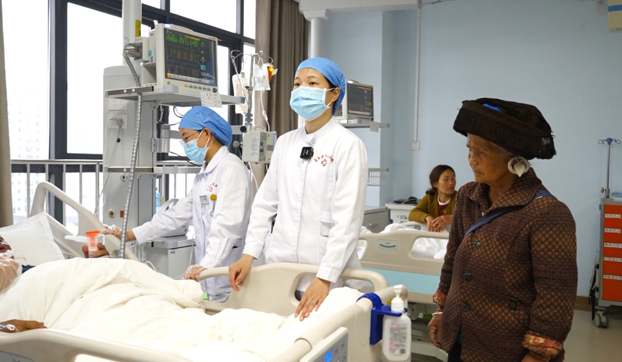 走進貞豐縣人民醫(yī)院重癥監(jiān)護病房,里面住著七八個病人,監(jiān)護儀上顯示著病人的血氧、血壓、心率等信息。這里住著一位老阿婆,今年75歲,長期患有冠心病,兩年前摔倒后一直在家臥床,出現肌肉萎縮。吳連月走近病床,協助老人翻身拍背,檢查皮膚情況及促進患者痰液排出,指導家屬翻身拍背技巧并進行相關知識宣教!皨輯蓍L期臥床,容易發(fā)生壓瘡及感染,要記得定時翻身拍背。”吳連月說。