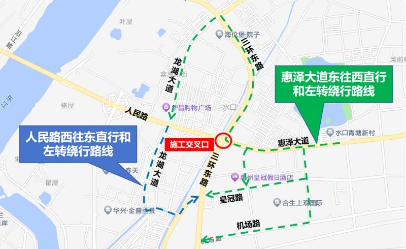 三環(huán)東路/惠澤大道交叉口施工期間,三環(huán)東路主線保持3車道通行,南進口和北進口禁止車輛左轉(zhuǎn)和右轉(zhuǎn),西進口和東進口禁止車輛直行和左轉(zhuǎn)。原有從隆生大橋-人民路-惠澤大道通行的過境車輛,請盡量通過中信大橋、東江大橋等過江通道外圍繞行;對于人民路沿線往返惠澤大道沿線的車輛,請從周邊三環(huán)東路、龍湖大道、皇冠路、機場路等道路近端繞行。