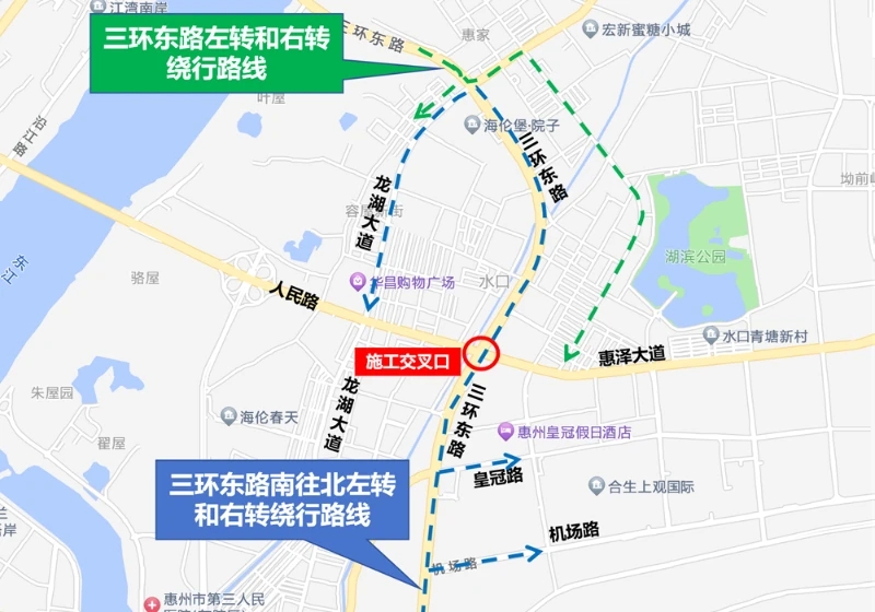 三環(huán)東路/惠澤大道交叉口施工期間外圍繞行示意圖。