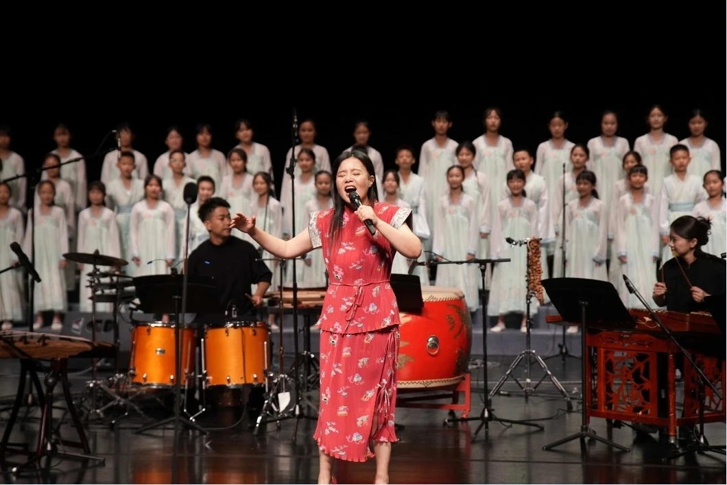 音樂會每到一城,龔琳娜都會與當(dāng)?shù)貎和铣獔F合作,本次來到惠州,龔琳娜與惠州市第十一小學(xué)金榜分校合唱團合作了《木瓜》《夢想號子》,其中《木瓜》選自《詩經(jīng)·衛(wèi)風(fēng)》!昂芏嗟胤降膬和铣獔F都是通過青少年宮精挑細選后組成,沒想到在惠州的一個小學(xué)里,能夠有這么多優(yōu)秀的孩子。不但音準、節(jié)奏很好,精氣神也很飽滿。我希望孩子在臺上演唱《詩經(jīng)》的時候,能夠?qū)鹘y(tǒng)文化有一種自豪感,這樣他們以后再去學(xué)古詩詞,再去了解我們的民歌,就不會覺得很遙遠了!饼徚漳日f。