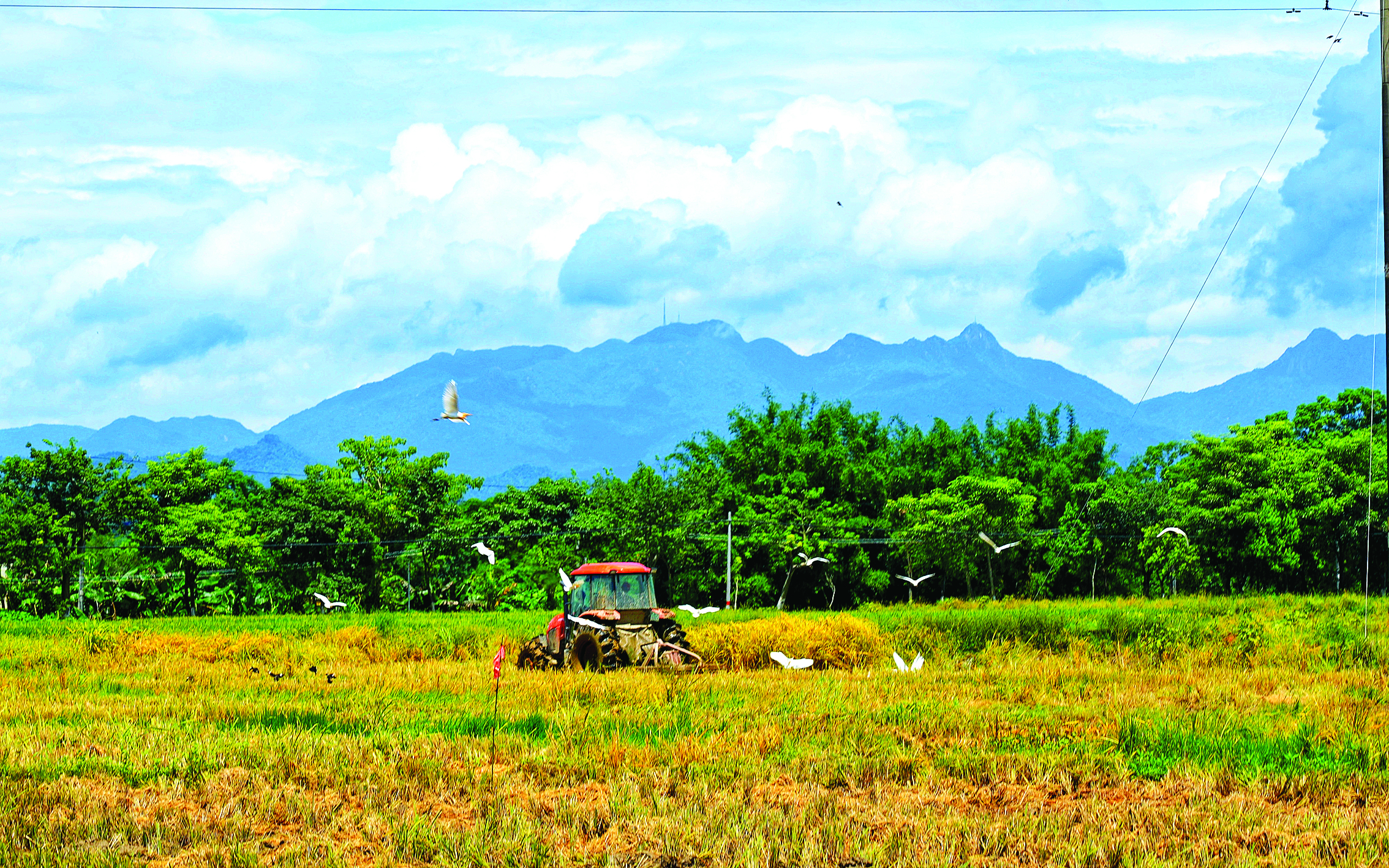 在橫瀝鎮(zhèn)新榮村的田野上,早稻收割忙,鳥兒覓食歡,一派和諧景象。