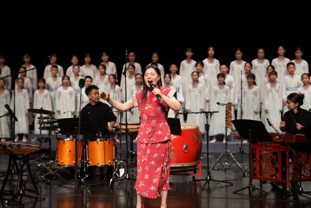 音樂會(huì)每到一城,龔琳娜都會(huì)與當(dāng)?shù)貎和铣獔F(tuán)合作。本次來(lái)到惠州,龔琳娜與惠州市第十一小學(xué)金榜分校合唱團(tuán)合作了《木瓜》《夢(mèng)想號(hào)子》,其中《木瓜》選自《詩(shī)經(jīng)·衛(wèi)風(fēng)》!昂芏嗟胤降膬和铣獔F(tuán)都是通過(guò)青少年宮精挑細(xì)選后組成的,沒想到惠州一所小學(xué)有這么多優(yōu)秀的孩子,不但音準(zhǔn)節(jié)奏好,精氣神也很飽滿。我希望孩子們?cè)谂_(tái)上演唱《詩(shī)經(jīng)》的時(shí)候,能夠?qū)鹘y(tǒng)文化保持一種自豪感,這樣他們以后再去學(xué)古詩(shī)詞,再去了解我們的民歌,就不會(huì)覺得很遙遠(yuǎn)了。”龔琳娜說(shuō)。
