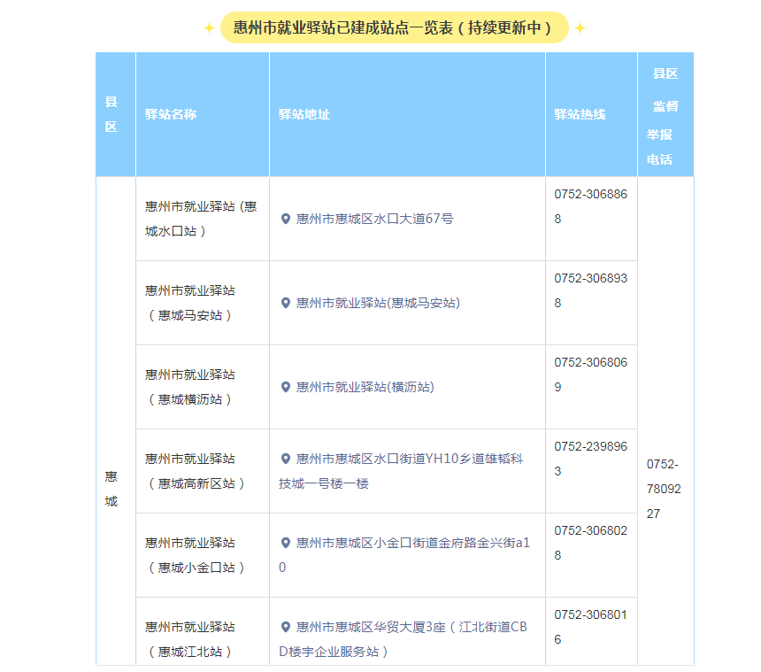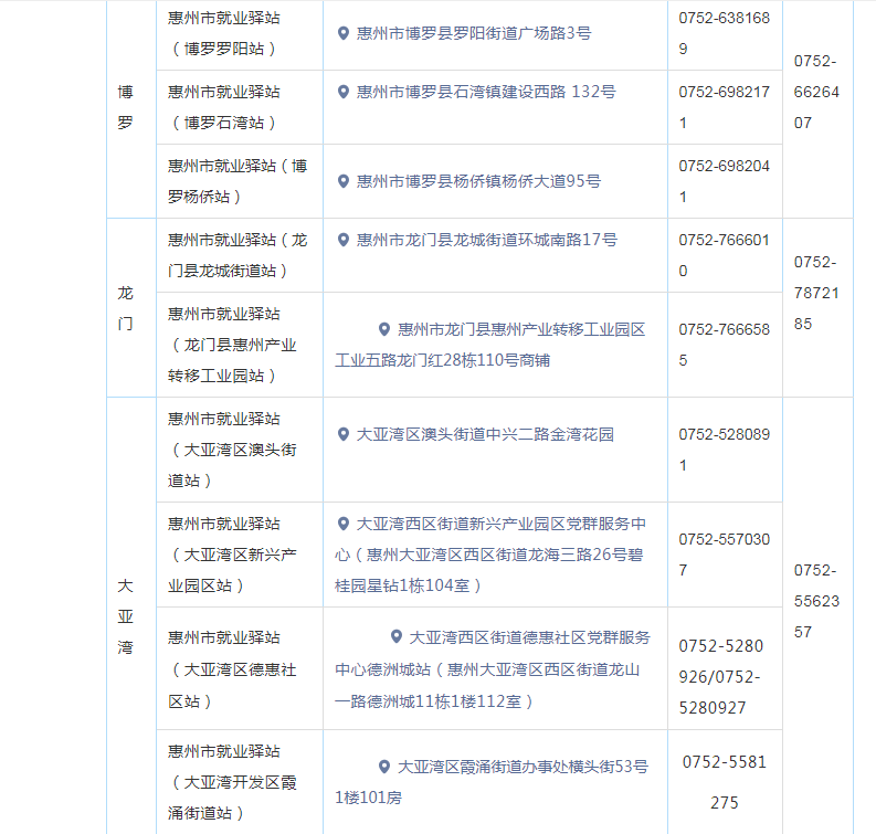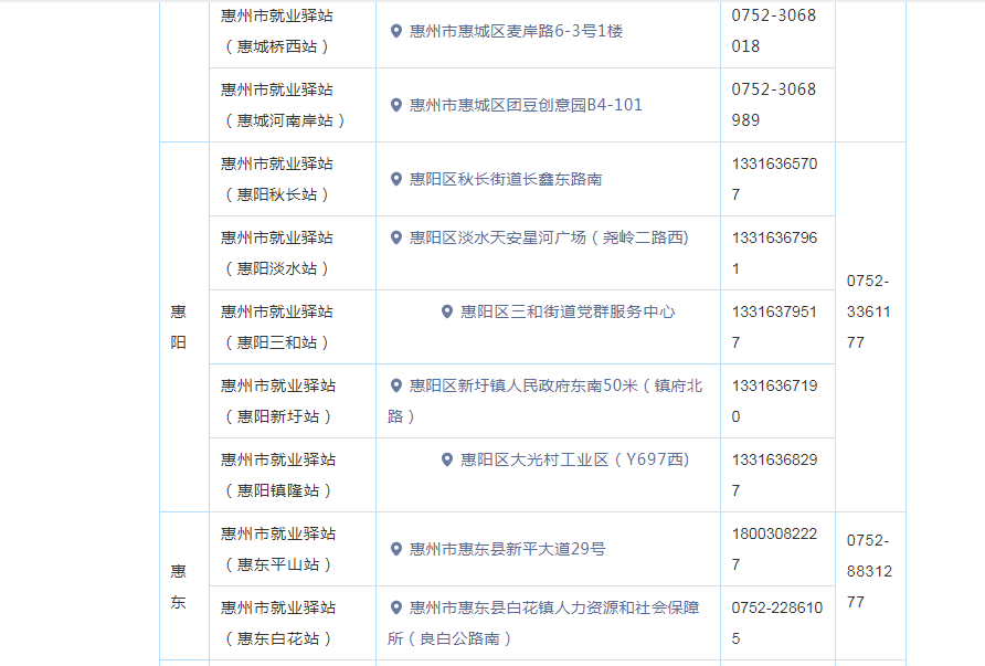表格來源:惠州人社(數(shù)據(jù)截至7月18日。注:由于就業(yè)驛站尚處于試運(yùn)營階段,個(gè)別就業(yè)驛站的熱線、地址會有調(diào)整,屆時(shí)市人社局官網(wǎng)和“惠州人社”公眾號將對調(diào)整的就業(yè)驛站工作熱線或地址進(jìn)行更新。)