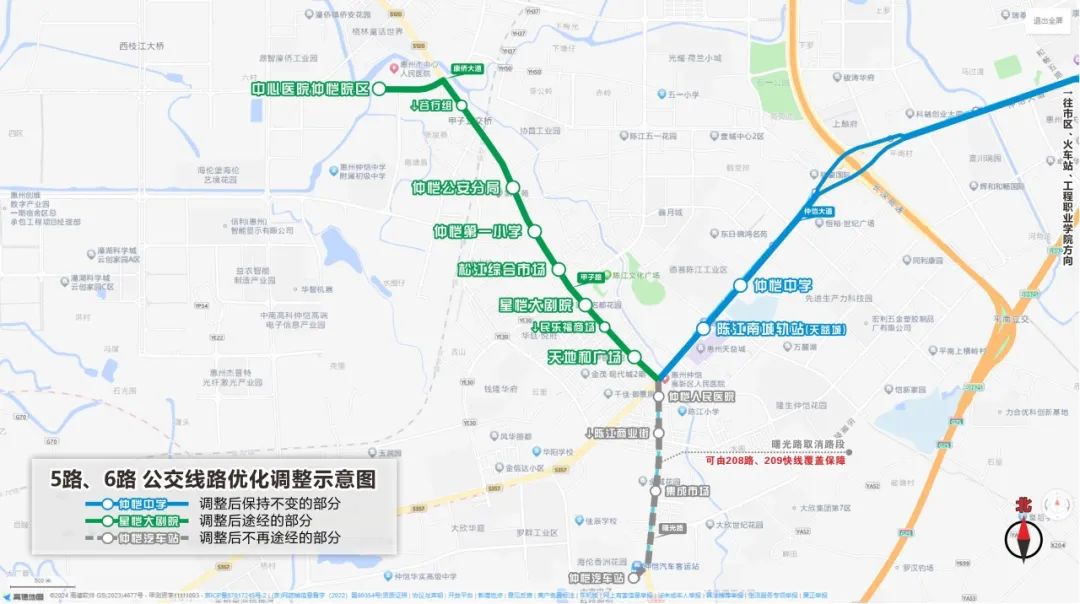 線路調(diào)整:取消5路仲愷人民醫(yī)院、陳江商業(yè)街、集成市場(chǎng)、仲愷汽車站等4個(gè)站點(diǎn),改由曙光路口延伸經(jīng)甲子路、康僑大道至中心醫(yī)院仲愷院區(qū)。
