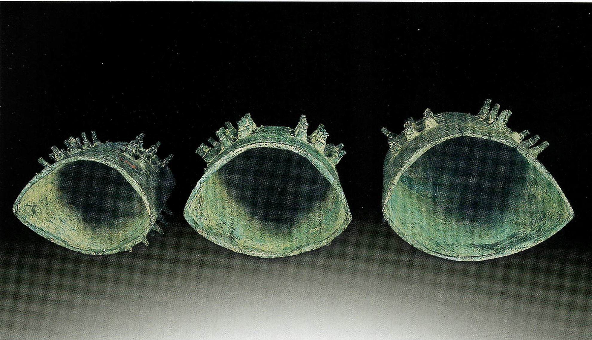 1984年,博羅縣公莊鎮(zhèn)陂頭神村大瀝散屋村民小組一老農建房子挖墻溝時,鋤頭下碰到一件硬物,一套7件完整的春秋時期青銅編鐘就此出土,轟動了整個廣東考古界。《博羅文物志》記載:“這七件編鐘的重量分別為10.75、8.9、5.9、3.2、2.75、2.15、1.8公斤。均作高甬,甬部中空,斡旋齊備。每面各有十八個細長的枚。背面無紋,舞面及正面篆部、鼓部均飾勾連云雷……”其中三件,有明顯的調音銼磨痕,應為實用器。