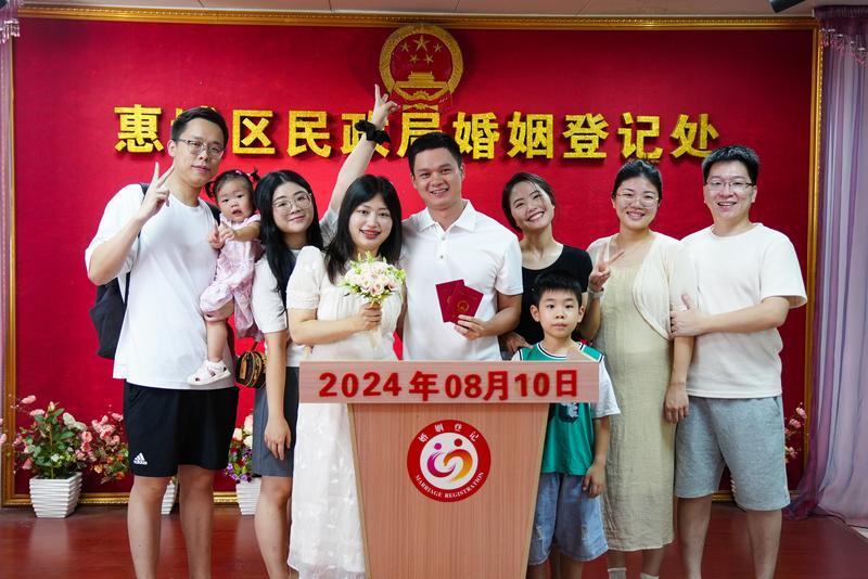 當(dāng)天上午8時30分許,記者來到惠城區(qū)民政局婚姻登記處看到,新人們井然有序地在前臺領(lǐng)表填表,等待窗口叫號。他們有的身著情侶裝,有的頭戴白紗,有的手捧鮮花,有的帶“親友團(tuán)”前來見證,讓結(jié)婚登記充滿儀式感。