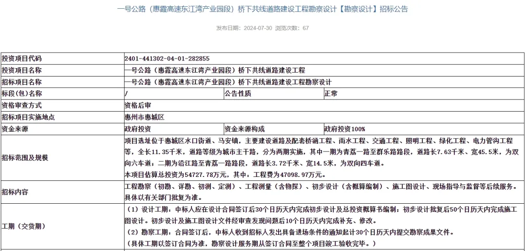 近日,惠州市公共資源交易中心發(fā)布了《一號公路(惠霞高速東江灣產(chǎn)業(yè)園段)橋下共線道路建設(shè)工程勘察設(shè)計(jì)【勘察設(shè)計(jì)】招標(biāo)公告》。