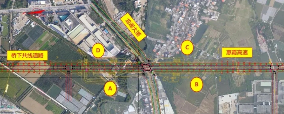 起點(diǎn)定于萬年村附近與沿江路交叉,起點(diǎn)樁號AK13595.965;終點(diǎn)與群樂路交叉,樁號AK24946.807(與惠霞高速樁號一致)。