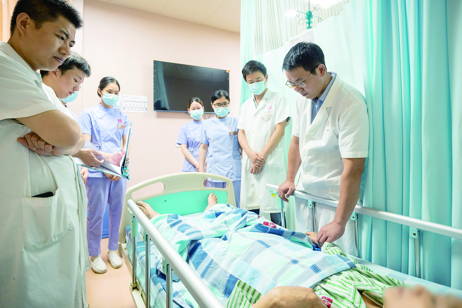 華康醫(yī)院骨傷關(guān)節(jié)創(chuàng)傷科主任周武忠(右一)查看患者恢復(fù)情況。