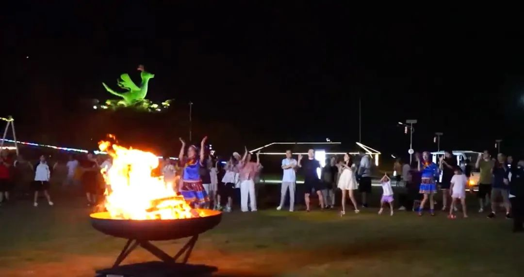 晚上 8 點,音樂噴泉和燈光秀在鹿鷹園準時上演,噴灑而出的水霧,還為周邊游客帶來了絲絲清涼。除了音樂噴泉和燈光秀,國家非遺項目打鐵花和來自龍門藍田鄉(xiāng)的省級非遺項目舞火狗也接連上演,其中圍繞篝火進行的舞火狗活動還會帶動游客一起加入狂歡。