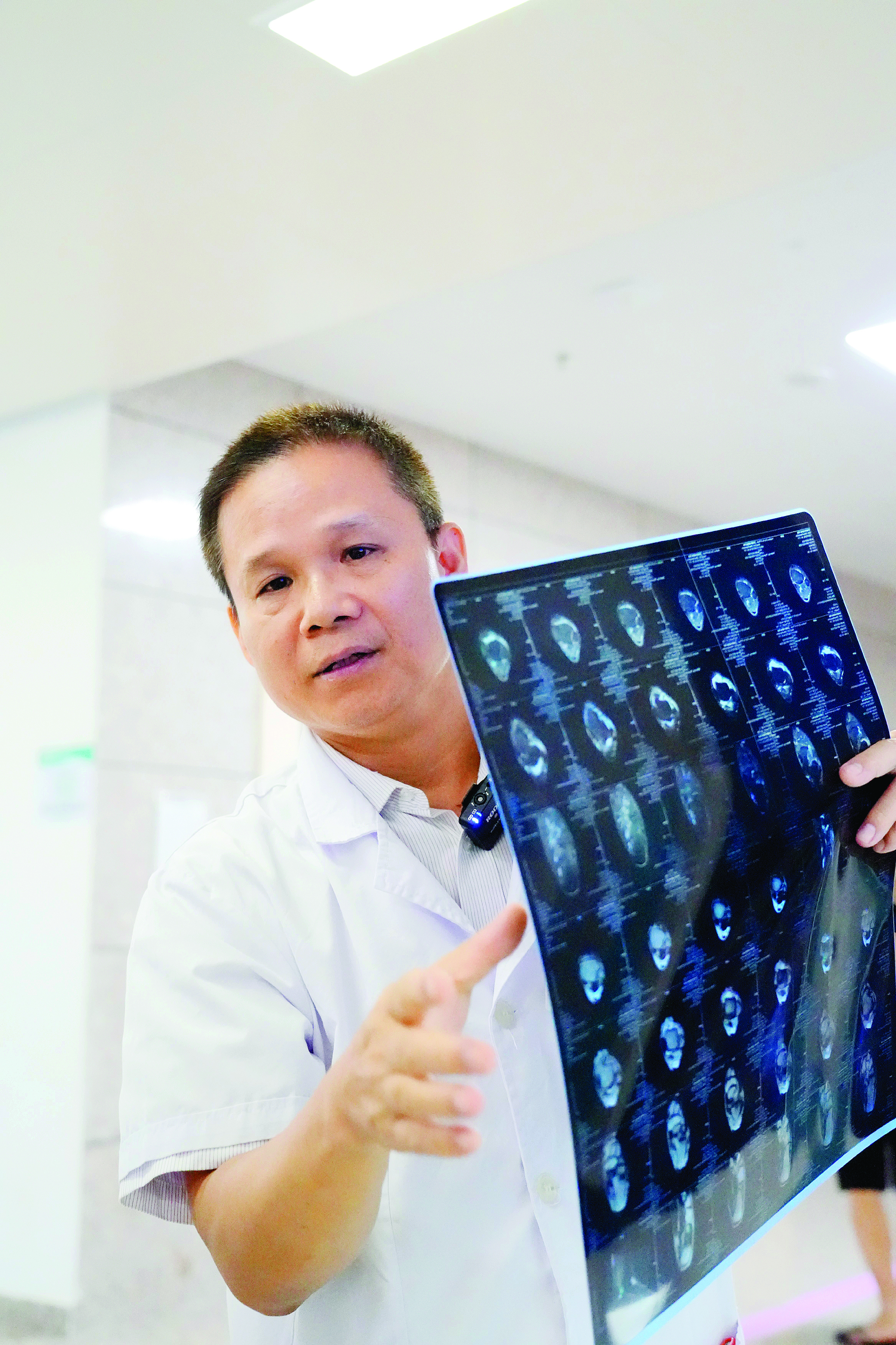 辦公桌上放著兩個(gè)屏幕顯示影像片子,在吳慧忠眼里,這些醫(yī)學(xué)影像片子“會(huì)說(shuō)話”,通過(guò)黑白語(yǔ)言,傾訴身體中的病癥。他猶如一名“偵察兵”,在復(fù)雜的黑白影像間“突擊”,于細(xì)微之處找出威脅患者身體健康的“元兇”。