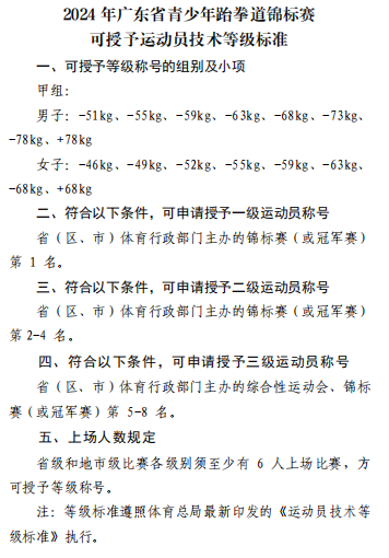 廣東省青少年跆拳道錦標賽是年度全省競技水平最高、參賽規(guī)模最大的跆拳道專業(yè)賽事,在比賽(甲組)中取得相應成績的運動員可授予國家一級、二級、三級運動員。